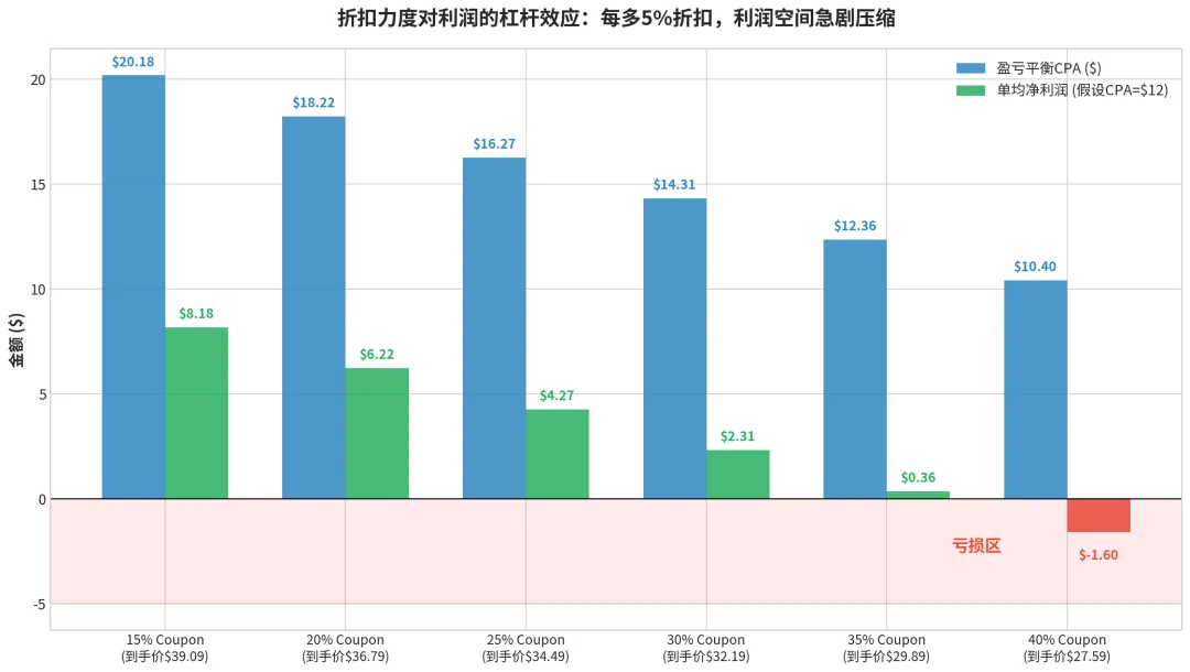 •当我们为了冲销量,将折扣稍微加大一点,设置 30% Coupon 时,盈亏平衡 CPA 骤降至 $13.28。