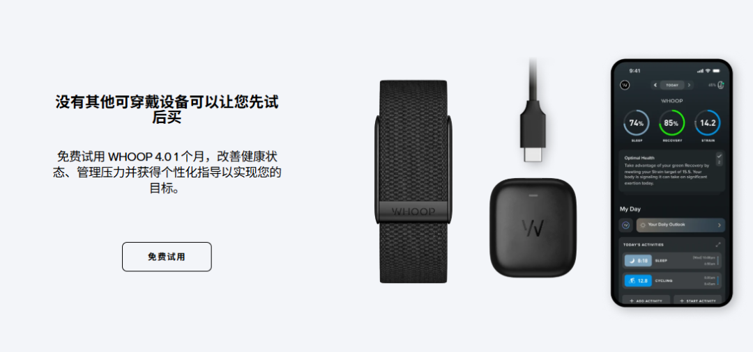 核心在于,WHOOP将产品力与营销策略高度融合,用真实体验驱动用户转化。在其官网上,WHOOP推出了“Try WHOOP Free for 1 Month”活动,向潜在用户开放4.0版本手环的免费试用。用户可在一个月内无门槛体验全功能服务,若不满意,只需支付8.99美元运费即可退还设备,甚至可以直接升级换购最新的5.0版本。这种“先体验、后决定”的方式极大降低了用户的初次决策门槛,提升了产品转化率,也展现了品牌对自身产品力的信心。