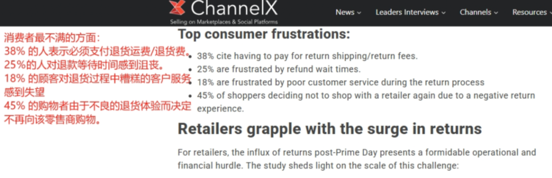 而从消费者最不满的方面来看,38%的人表示必须支付退货运费/退货费,25%的人对退款等待时间感到沮丧,还有45%的购物者由于不良的退货体验,决定不再向该零售商购物。