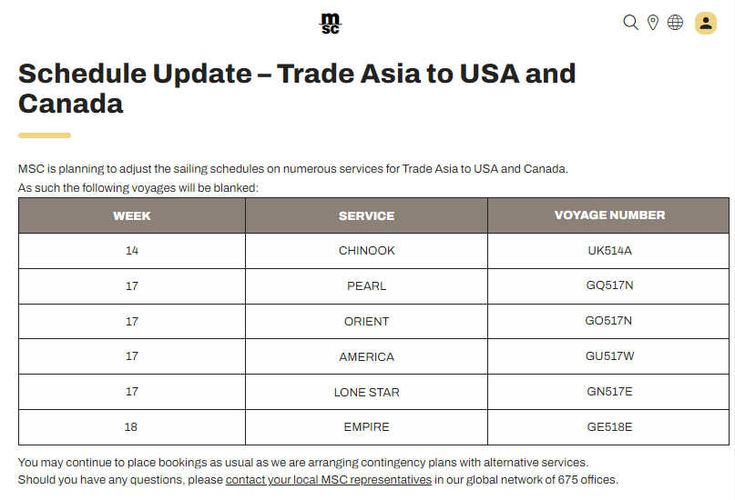 面对运价持续走低的趋势,全球航运巨头地中海航运(MSC)已采取行动。该公司日前发布通知,宣布取消跨太平洋航线6个航次。具体包括:
