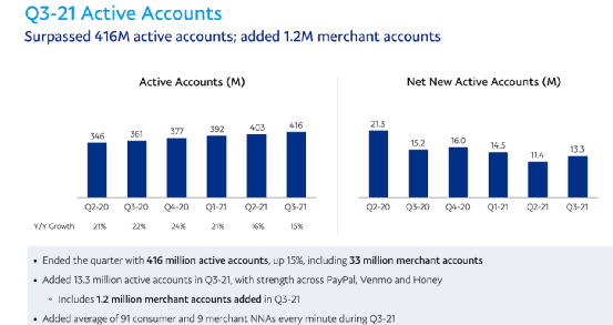 Venmo中隐藏的宝藏以36%的速度增长。PYPL还能够以强劲的速度增长其活跃账户,即使在艰难的大流行的可比性之上。