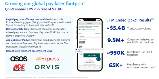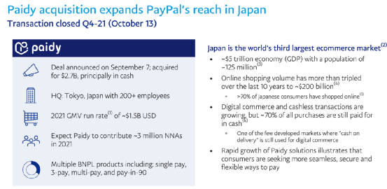 PYPL对其BNPL能力进行了深入投资,这不仅体现在他们的内部解决方案上,还体现在他们以27亿美元收购了Paidy,这使他们进入了日本的电子商务市场。