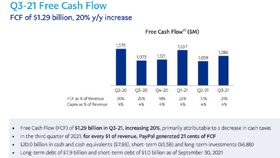 首先,PYPL已经产生了充足的自由现金流,自由现金流利率为21%。