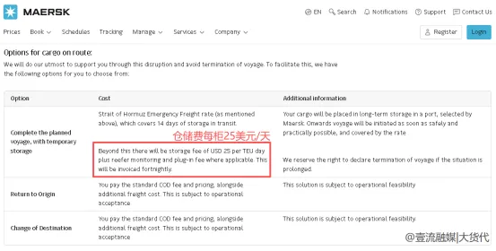 按原计划完成航程,进行临时存储——马士基将收取上述紧急货运费率,以及每个标准箱每天25美元的仓储费、冷藏箱监控费和插电费(如适用),同时如果情况持续恶化,马士基保留终止航程的权利。