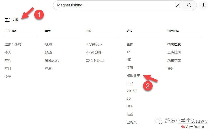 我们回到Youtube视频的关键字搜索框,点击左下的过滤选项,在功能中找到知识共享选项