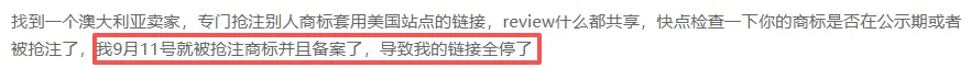虽然大规模抢注事件被曝光,但澳大利亚商标的抢注之风并未停歇,在此之后依旧有不少卖家反馈自己的商标被人以个人名义抢注,甚至有卖家因此链接全停,损失惨重。