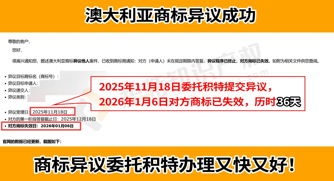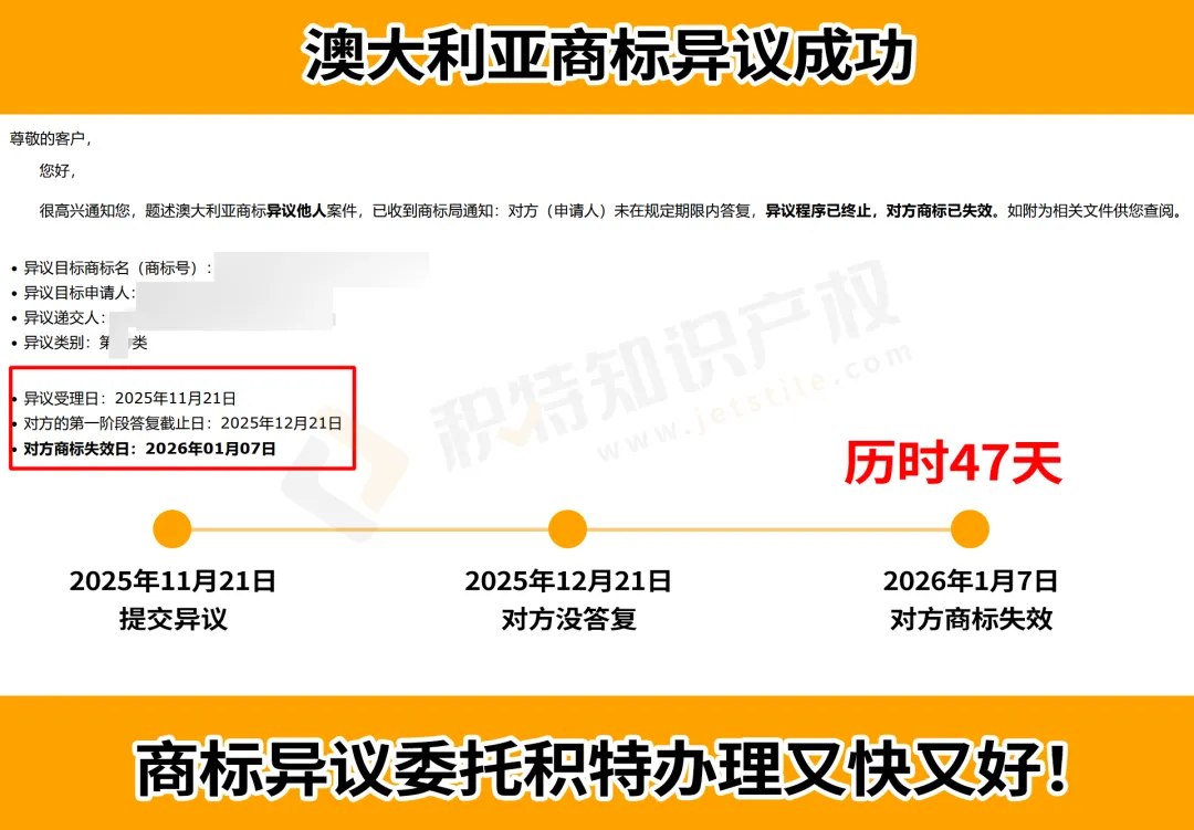 在积特处理过的澳大利亚商标异议案件中,就有多起因对方(申请人)未在规定期限内答复异议成功的: