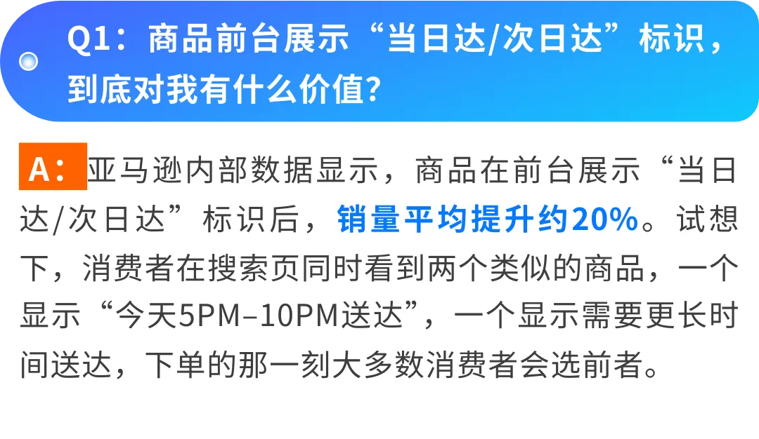 去年,亚马逊为Prime会员实现了超130亿件商品当日达或次日达配送,同比增长30%。亚马逊的数据显示,当日达/次日达商品销量平均提升20%。[1]