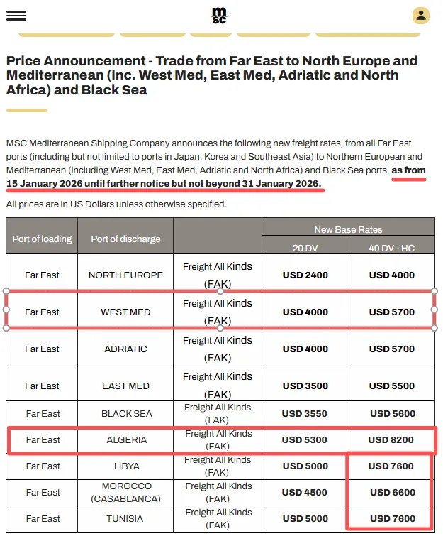 MSC地中海航运公司宣布,自2026年1月15日起,从所有远东港口(包含但不限于日本、韩国及东南亚各港口)运往北欧和地中海地区(涵盖西地中海、东地中海、亚得里亚海及北非相关港口)以及黑海港口的货物,运费将按照新标准执行,相较于1月初的运价再提高100-300美元,最高达8200美元。