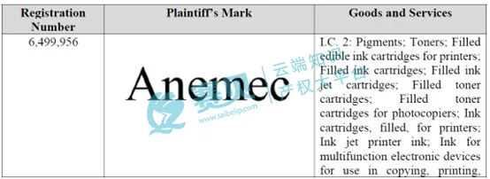 案件核心是原告拥有的美国注册商标 "ANEMEC",注册号是 6,499,956,注册在第2类,涵盖打印机墨水、墨粉相关产品,各类填充式墨盒、墨粉盒,还有水彩颜料等。赛贝提醒未经授权使用,尤其是在相同或类似商品上使用相同商标,可能构成商标侵权。