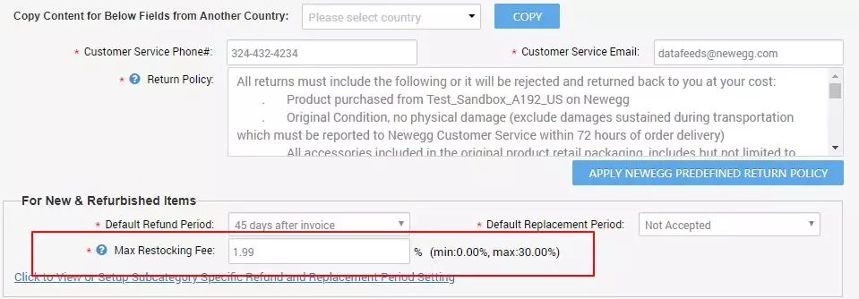 每每收到新订单提醒的时候,我们都兴高采烈。可是过几天,消费者又要求无理由退换货,咱们卖家肯定都会不禁为重新入库、打包的费用而感到委屈连连。 不过不用担心,贴心的蛋蛋酱已经为大家找到了补偿损失的小妙招:巧用restocking fee! Newegg国际商城允许商家在顾客退换货的过程中收取一定的手续费,即restocking fee(重新入库费)。restocking fee的引入主要是考虑到一些消费者在收到商品并开封后,却因后悔购买或其他非商品质量的原因申请退货的情况,这种退货并非因为商品本身或者商家问题造成,却给商家造成了一定的损失。所以restocking fee化身天使出现,有效的降低了商家处理退货的成本。该项费用按商品价格的一定比列收取(0%-30%不等),具体取决于商品类型及退货时的商品状况。(商品价格不含运费) 有人就要问了,电商时代,拼的就是消费者满意度,向他们收取退换货费用,会不会降低我的消费者满意度,从而影响销量呢? 蛋蛋酱想说的是,客户满意度要照顾,但是自己的损失也要注意哦,不然利润受损,哭泣的还是我们自己。 至于究竟要收取多少restocking fee这个问题,您可以提前对商品重新入库的成本进行估算,以此来决定是否要收取及收取的比例。当然,如果您所售产品的重新包装入库费用较低,您又想照顾消费者的心情,那么也可以打出零费用无理由退换货的招牌,借此吸引新顾客、稳定老顾客。 下面蛋蛋酱将带着大家了解restocking fee的设置流程:登录seller portal > shipping Setting >Return Policy and Info 页面 图1 图2 在上图1所示的shipping setting页面红色方框内,及图2所示的具体退货页面的红色箭头处,填写重新入库费的收取比例(最高为商品价格的30%)就可以了。以后,当有消费者申请退货时,系统就会自动向消费者收取一定比例的重新入库费了,来补偿您的退货损失。 注意 即使您在shipping setting页面设置了以最高比例收取重新入库费,但是在处理具体退货时,系统仍然默认重新入库费比例为0%,您需要根据实际情况自行填写。 退换货中,除了restocking fee之外,还有两个常见的退款情况,即全额退款和部分退款。蛋蛋酱再给大家简单介绍一下。 在退货期内遇到以下情况,消费者可申请全额退款 • 商品本身的问题,如破损 • 未开封的商品 • 商品与网站陈列商品不符,寄错商品 在退货期内遇到以下情况,消费者可获得部分退款 • 因客户个人原因退货而非商家或商品问题, 如后悔购买 • 未开封但已超过规定退货时间 好了,今天的科普小课堂结束啦。 希望大家能根据自己的实际情况,认真衡量,选择一种或多种适合自己的退换货费用收取方式。当然,蛋蛋酱更希望大家每一个卖出的东西都能收到五星好评,零退换货!