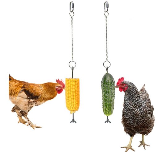 这款款鸡肉蔬菜喂食器设计为带有挂链和挂钩的串肉串,可以轻松挂在鸡舍中。