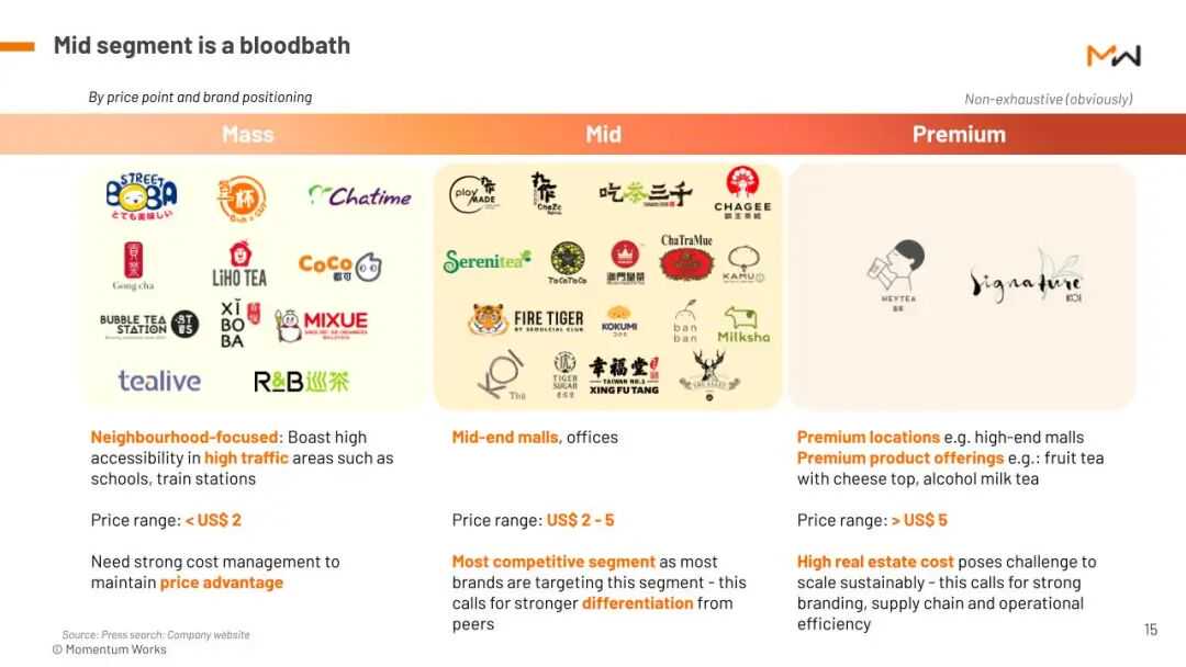 下图是墨腾2022年的一份关于东南亚茶饮的报告,提到在大众和中端两个消费区域竞争都非常激烈: