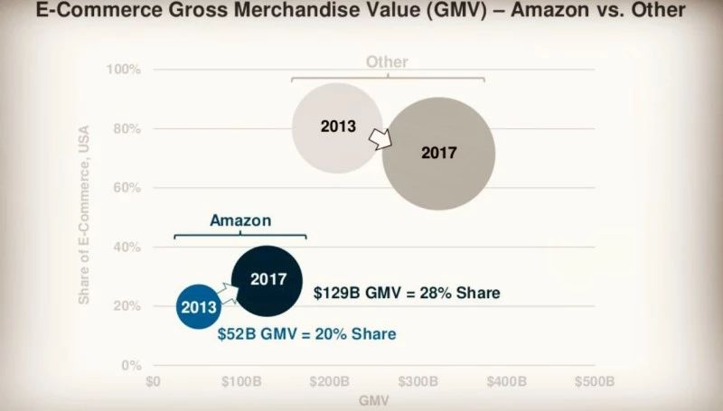 随着整体在线销售额的增长,亚马逊的电商GMV( gross merchandise value,成交总额)所占份额也在增长,从2013年的20%(520亿美元)增长到2017年的28%(1290亿美元),相应地,其他电商企业所占的总体份额肯定要减少。