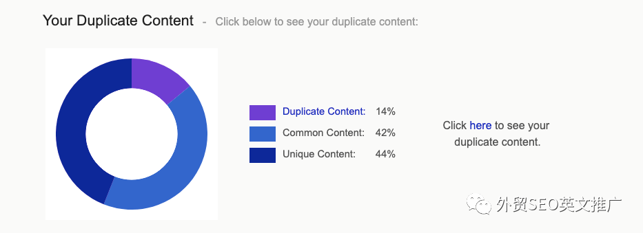 在概览里面,我们可以看到整个网站的内容重复度状况。如果网站的内容重复度(Duplicate Content)高于20%,则为垃圾网站。另外还要注意一下Common Content的比例,一般控制在32%左右,如果比例过高,也会影响网站的收录。