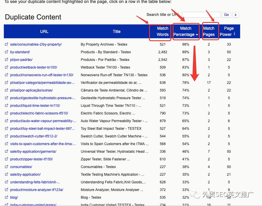 如果想查看到底是哪些页面的内容是重复的,可以查看具体的URL。系统提供了页面的重复字数,重复度以及与之相匹配的页面,我习惯上对重复度进行一个从上到下的排序,这样就可以首先修改重复度比较高的页面。