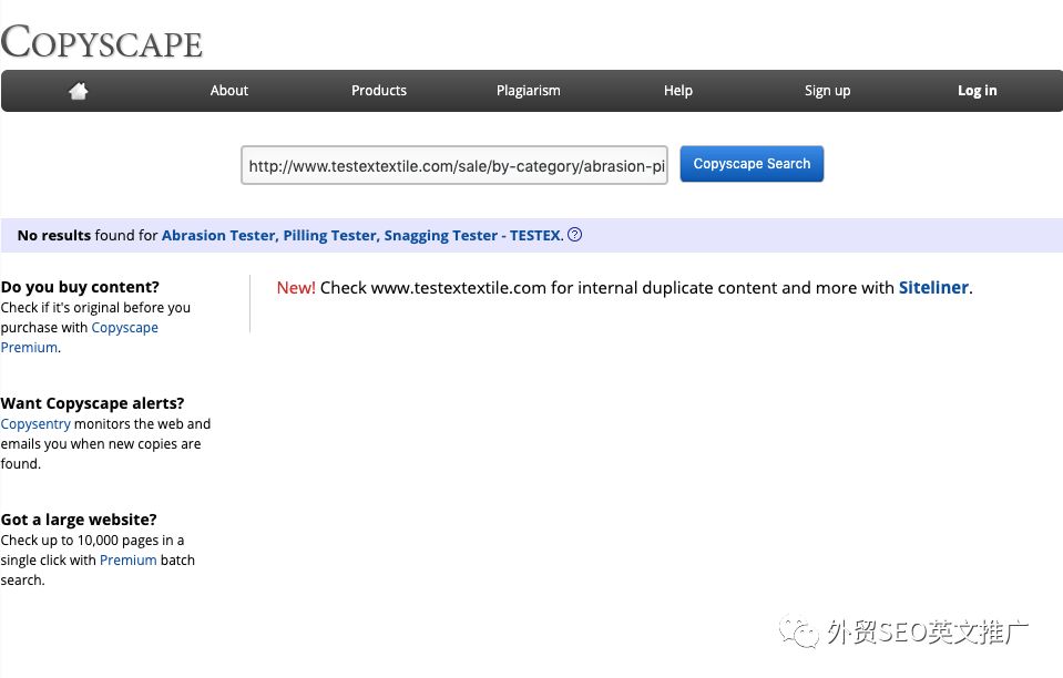 如图所示,输入域名,即可查看内容是否有重复。需要注意的一点是,Copyscape只能是单个网页去进行检索,没有办法一次性完成整站检测。