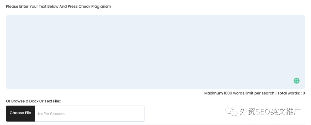 Duplichecker主要是用于文本重复度检测,免费账户也是有1000字符的限制。你可以直接粘贴文本进行检测,也可以上传文件进行检测。无需注册,方便快捷,但缺点也是广告比较多,影响体验。