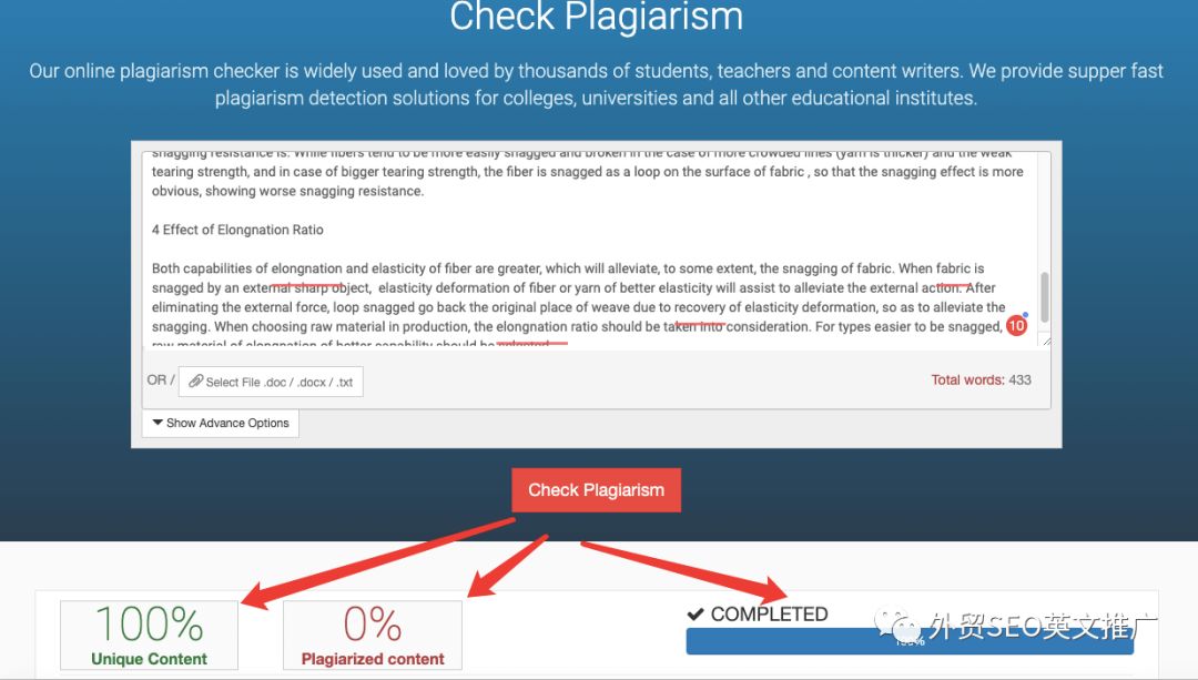 Check-plagiarism同样支持文本检测和网页检测。这个网站的界面就比较干净整洁,使用起来很方便。直接输入想要检测的内容,点击Check Plagiarism, 系统便会显示原创内容(Unique Content)的比例和 重复内容(Plagiarized Content)的比例。