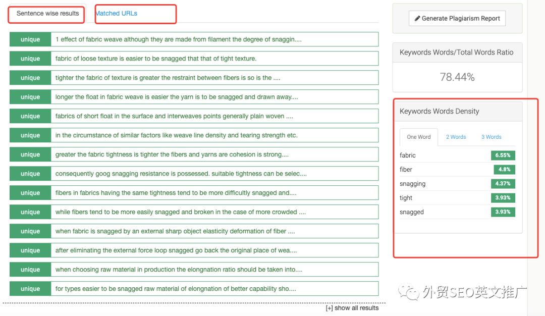 除此之外,我们可以看到每一个句子的内容重复度检测显示,如果有重复的内容还会显示与之相重复的网页。