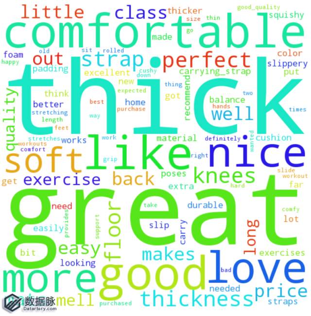 在所有的买家评论中,“thick”或“thickness”等表示厚度的词汇出现次数最多,达到1298次;除了“great”、“comfortable”等赞扬的词汇外,柔软度“soft”(出现327次)、绑带“strap”(出现296次)也是买家谈论的热点;此外,谈论价格和气味的词汇“price” (出现253次)、“smell” (出现189次)出现也较为频繁。