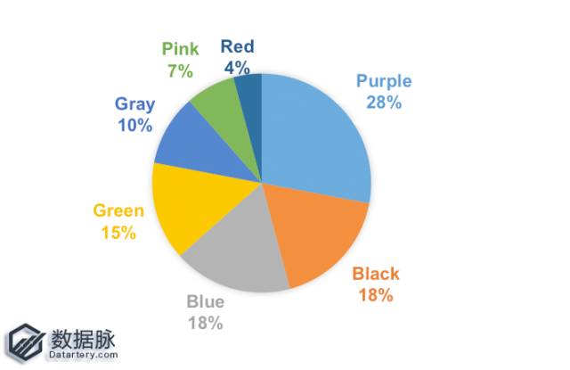 在所有的评论中,紫色累计评论最多,达到总评论量的28%,黑色和蓝色不相上下,累计评论占比均为18%,红色累计评论数最少。