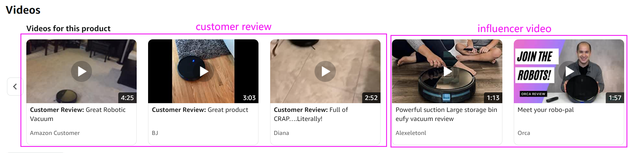 再者,这6个视频有啥不同呢?下面截图可以看出,1个是品牌卖家自己上传,其余5个是Amazon Influencer Video, 记住,这个位置,只能出现这两个类型的video!