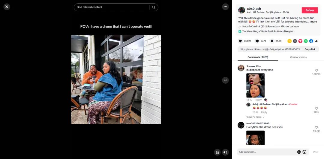 她没有讲产品参数,而是用“POV:我有一台不太会操作的无人机”的趣味视角,一边吐槽“它好像要把我干掉”,一边开心玩闹,真实又有代入感。这条生活化的视频收获650k点赞、430万播放,还在LTK上挂出购买链接,实现“种草-转化”无缝衔接。