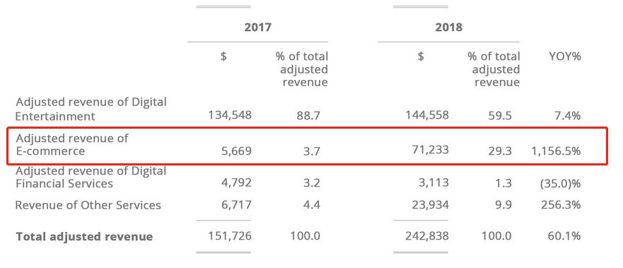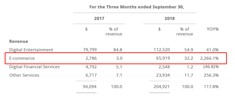 SEA的电商业务在第三季度的收入为6592万美元,相较于2017年第三季度的278万美元同比增长2266.1%。