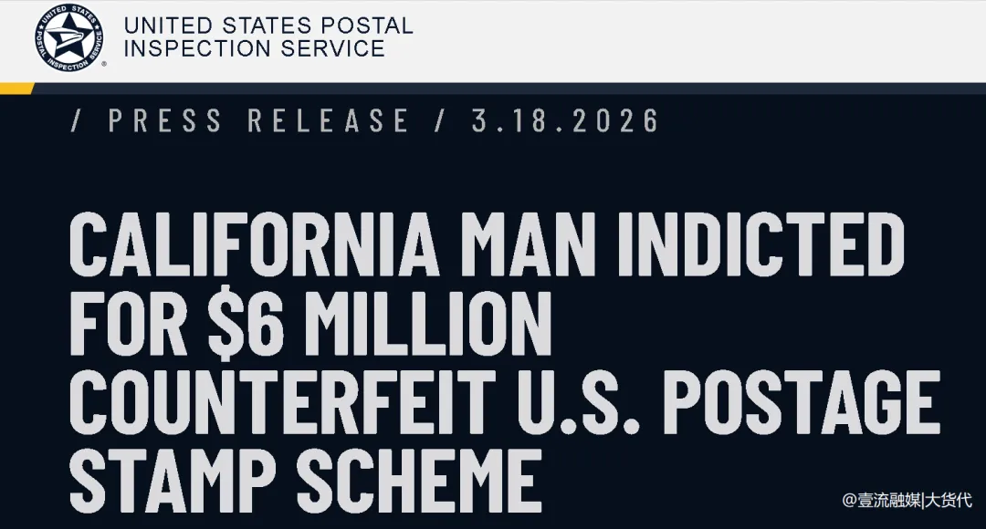 近日,美国邮政(USPS)通报一起涉嫌伪造邮资(跑水)的案件。