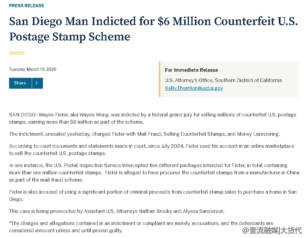 美国联邦大陪审团在起诉书中,指控韦恩·王自2024年7月起就利用其在电商平台上的账户出售伪造邮票。