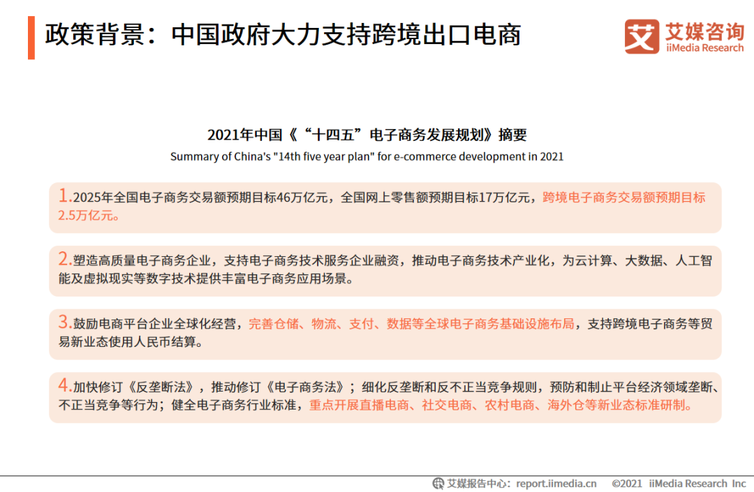 2021年11月4日,商务部、中央网信办、国家发展改革委三部门印发了《“十四五”电子商务发展规划》明确了 2021-2025年中国电子商务行业总体发展方向和任务,进一步提出了中国跨境商务交易额预期目标,明确了电子商务智能化、数字化、合规化等政策发展方向。