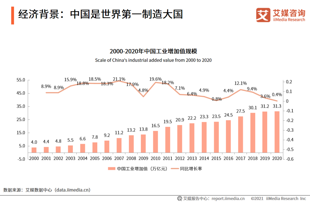 数据显示,2020年中国工业增加值为31.3万亿元,连续11年中国位居世界第一制造业大国。中国制造业对世界制造业贡献的产值比重接近30%。艾媒咨询分析师认为,中国具备强大的工业制造体系,为中国跨境出口电商的发展奠定了很好的物质基础。