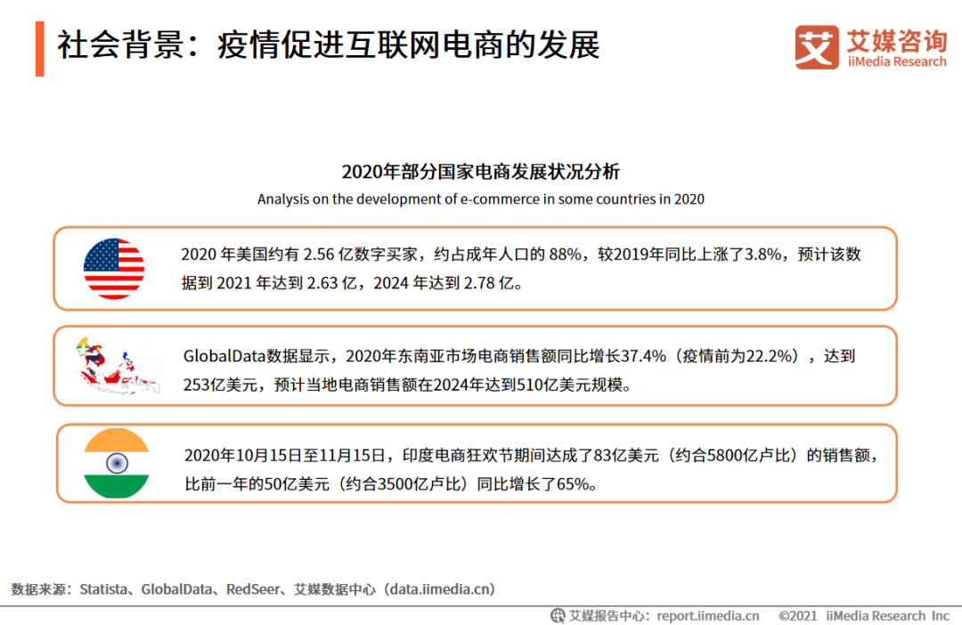 2020年在全球新冠疫情的冲击下,电商特有的“免接触”模式能在满足消费者日常消费下尽可能降低病毒感染的风险,受到全球广大消费者的喜爱,这将进一步加速用户线上消费习惯养成,促进电商行业的发展。