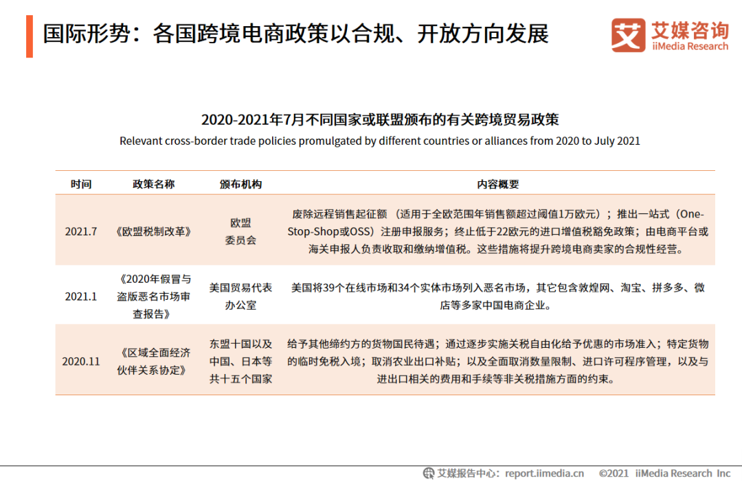 当前全球各国政府主体对跨境电商行业的态度呈现合规化和开放性趋势。2021年,美国和欧盟分别发布了《2020年假冒与盗版恶名市场审查报告》和《欧盟税制改革》,分别对跨境电商产品的版权、真劣以及跨境电商税务等方面提出了进一步的合规性要求。2020年11月,《区域全面经济伙伴关系协定》通过,将进一步促进该经济体内的商品交易,促进跨境电商的开放性发展。
