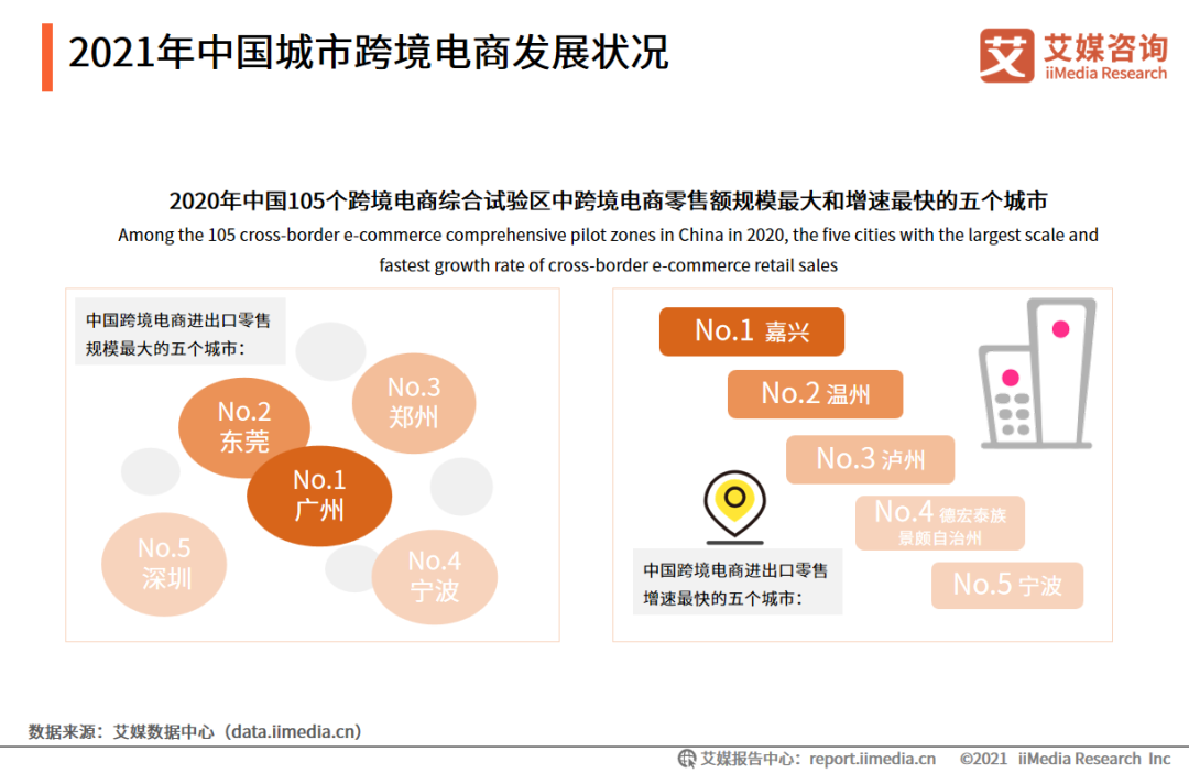 数据显示,在创立的105个跨境电商综合试验区中,跨境电商零售规模前五大城市分别为广州、东莞、郑州、宁波和深圳,跨境电商零售规模增速最快的五个城市分别为嘉兴、温州、泸州、德宏泰族景颇自治州和宁波。艾媒咨询分析师认为,跨境电商企业在这些跨境电商规模大或是增速快的区域中易融合当前产业链,借助当地政府的支持政策获得进一步的发展。