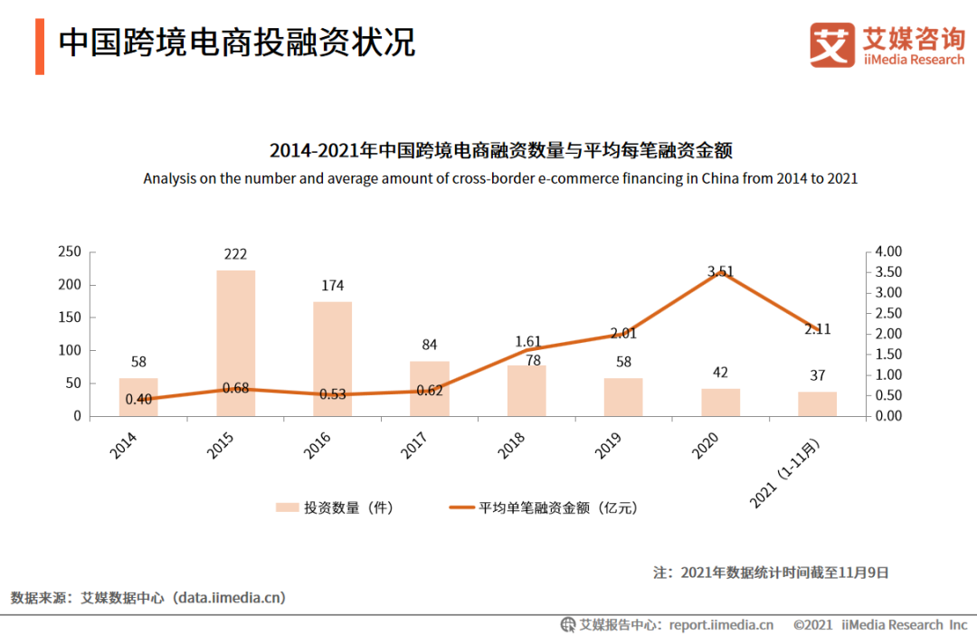 图表12. 2014-2021年中国跨境电商融资数量与平均每笔融资金额