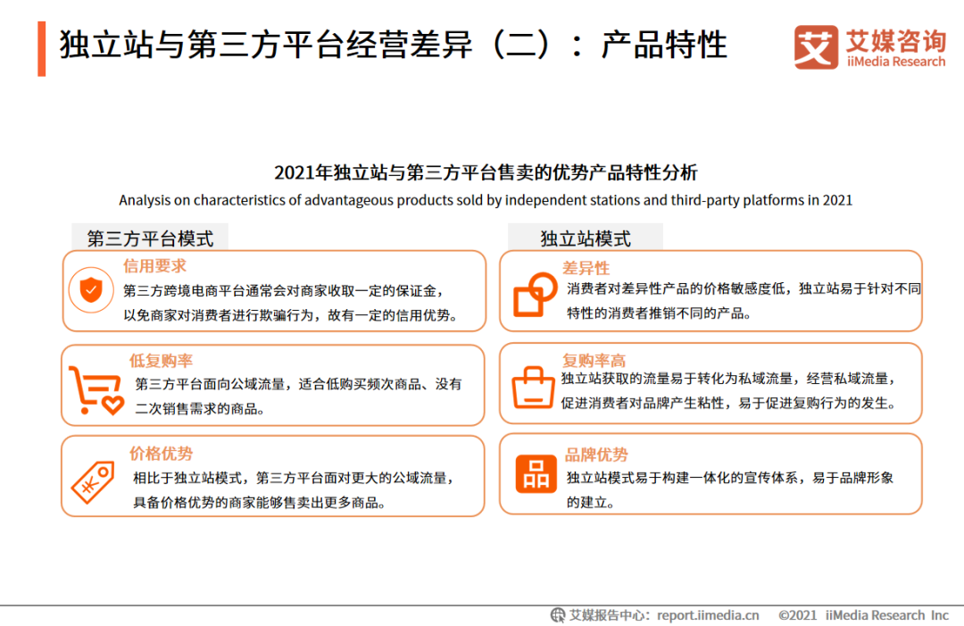 独立站与第三方跨境电商平台经营的优势产品特性并不相同,独立站经营的优势产品应具备差异性、品牌优势明显、复购率较高等特征。艾媒咨询分析师认为,不同的跨境电商出口商家应根据自身产品,选取合适的经营模式,才能获得自身发展的最大化。