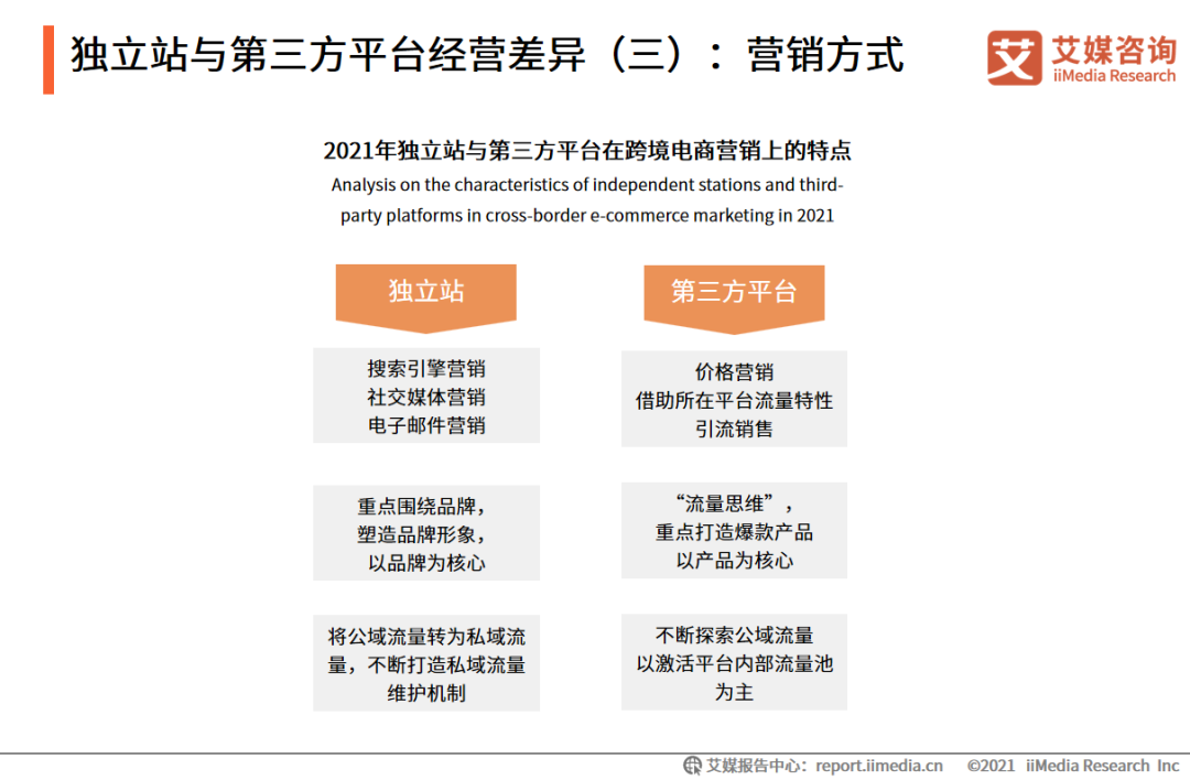 图表17. 2021年独立站与第三方平台在跨境电商营销上的特点