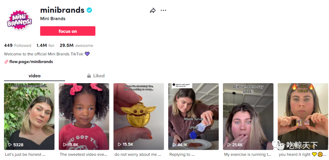 minibrands的TikTok账号@minibrands是在2020年开设的,目前的粉丝累计已有140万,而且认证了官方企业号,主页也放置了站内链接对旗下品牌进行引流转化。