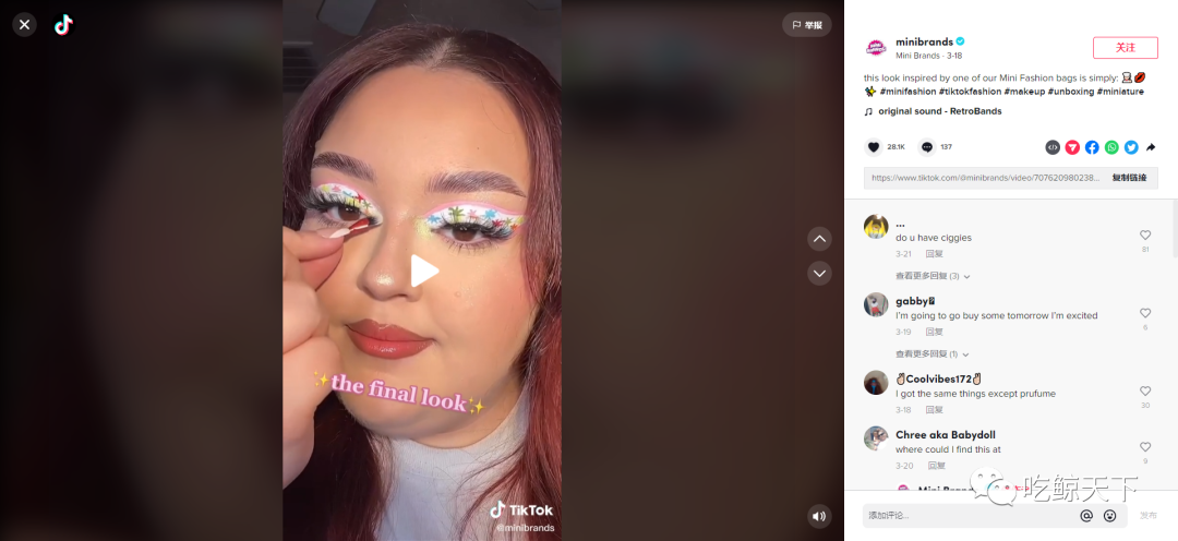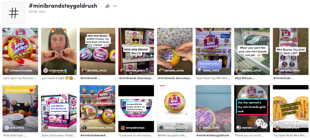 除了品牌同名标签,@minibrands所带的标签还有#minibrandstoygoldrush、#minibrandstoys等,基本都有着几十万的播放量。