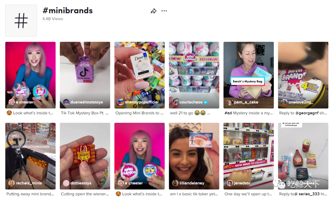 minibrands官方首先设立了一个标签话题,标签页的视频都是由TikTok网红和粉丝自发上传,点击TikTok搜索框,搜索#minibrands,会发现这个标签产生的阅读量已经达到了44亿多,成为了平台上的热门话题,同时也带火了视频里的产品。