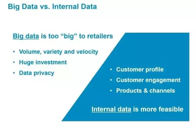 既然对于多数企业,大数据有些高不可及,那从企业内部数据出发更加可行。这些内部数据大致包括了客户资料、客户管理以及产品和渠道数据。