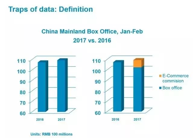 举个例子。这两张图都是中国电影的票房数据,可以看到2017年票房增长的很大一部分在于把电商网站的手续费也算入其中。但是,2016年没有算这手续费。通过改变票房的定义、扣除电商手续费后,数据结果很大程度上会改变。