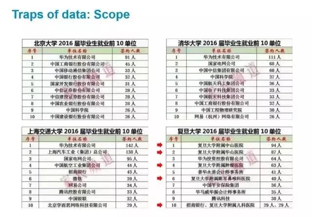 比如复旦的毕业生就业单位统计表上,出现了很多医院人才,那是因为它合并了本地医科大学,也被算进去了。统计范围不一样,数据就会有出入。