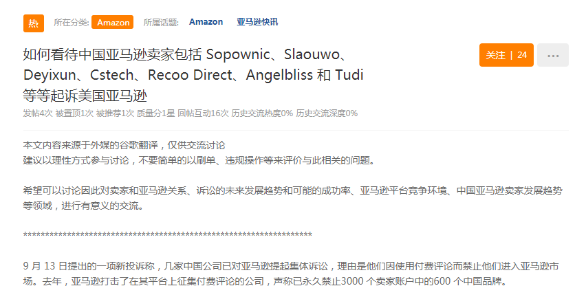 卖家A:好事!!!姑且不论孰对孰错,中国卖家勇于拿起法律武器保护自己的合法权益。一来提醒所有的中国卖家不要遇事就认怂,被亚马逊压榨就认倒霉,二来告诫亚马逊,中国卖家占据了亚马逊的大部分,是亚马逊的核心卖家,不要轻易得罪,注重中国卖家的利益。