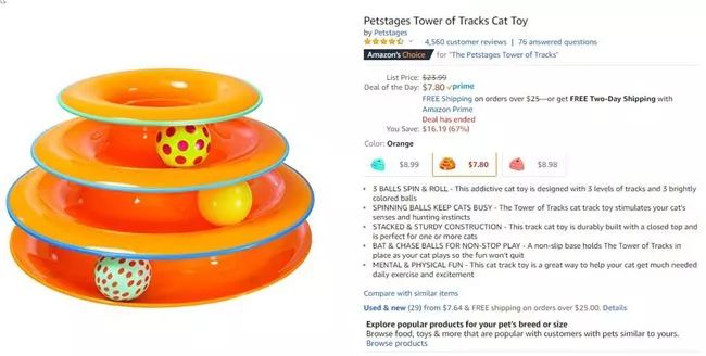 一款名为The Petstages Tower of Tracks的宠物猫玩具在亚马逊美国站火了。这款玩具定价低于10美元,斩获了4000+评论、4.6星评级,并在猫玩具球(Cat Toy Balls)类别中排名第一,许多客户对这款产品赞不绝口。有消费者在评论里称这是自己买过的最好的玩具,可以吸引猫咪的注意力,并且激发其乐趣,十分适合爱猫人士。于是,这个爆款就这样“偷走”了无数宠物人士的钱包。