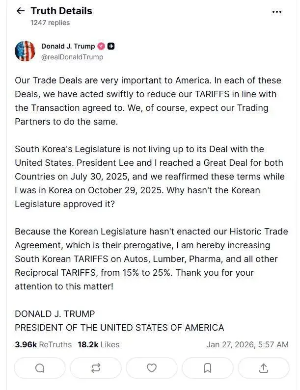 关税大棒加码!25%税率突袭韩国