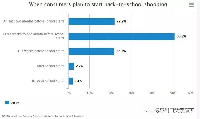 NRF还发现,68%的家长至少在开学的前一个月就会收到返校必备清单,这意味许多学生和家长从初夏就开始研究返校所需购买的产品。