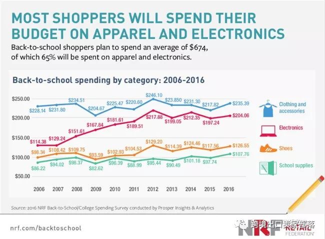 如下NRF的图表揭示了消费者在4个主要返校类别产品上的花费情况,消费者在返校购物季平均会花费674美元,其中服装与配饰、电子产品占据其中65%的支出: